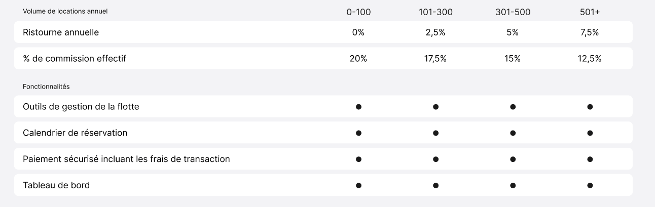 GoRide applique une commission standard de 20 % sur les locations de vélos, les locations d’accessoires, la vente de services additionnels (ex. entretien, ajustements, coaching, etc.), les dépôts de réservation pour l’achat en fin de saison, etc. Selon le nombre de transactions complétées par le Marchand sur la plateforme entre le 1er janvier et le 31 décembre, GoRide versera une ristourne au Marchand au début de l'année suivante.